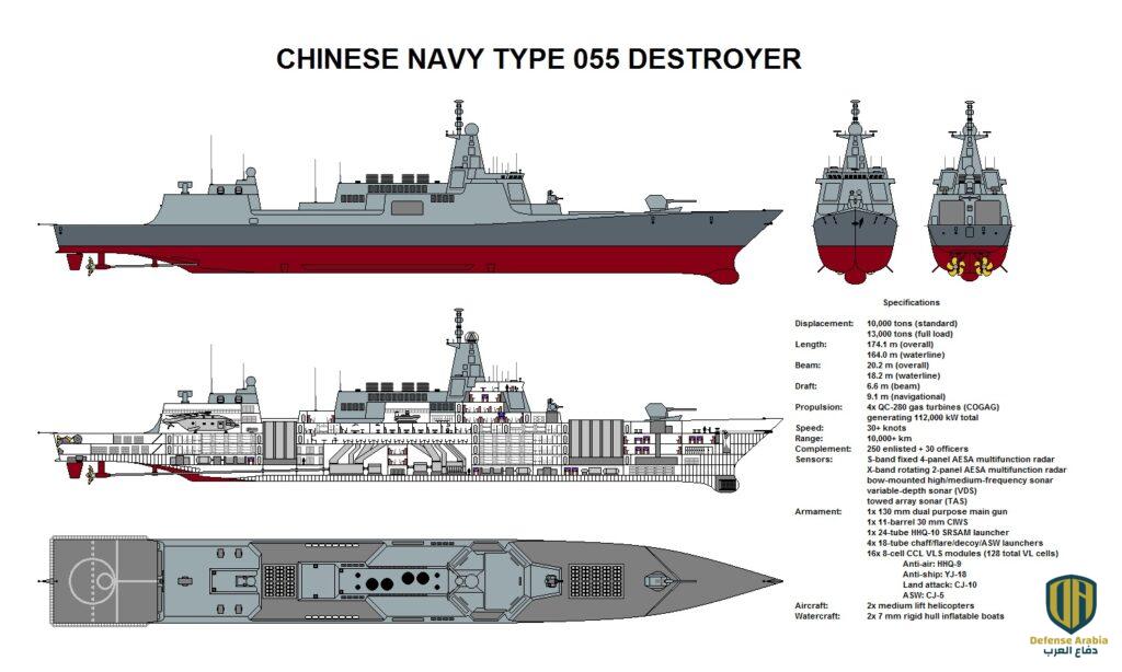 وتم تأكيد الأبعاد، في شريط فيديو تمهيدي يوضح قدرات نانتشانغ، المدمرة الأولى لهذه الفئة. واليوم، يعتقد أنه عندما يتم تحميلها بالكامل، يمكن أن تصل سعة السفينة إلى 13000 طن. للمقارنة: أقوى المدمرات الغربية والأكثر انتشارًا – “Arly Burke” الأمريكية – سعتها 9600 طن و 96 خلية للصواريخ، حسب موقع “ميلاتري ووتش”.