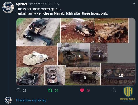 انتهت محاولة تركيا لأخذ زمام المبادرة في إدلب السورية بخسائر فادحة للجيش التركي. ففي خلال ثلاث ساعات فقط من المواجهة، فقدت القوات التركية ما لا يقل عن 10 دبابات وناقلات جند ومدرعات. وذلك بسبب ضربات دقيقة شنها الجيش السوري وفقاً للمعطيات.