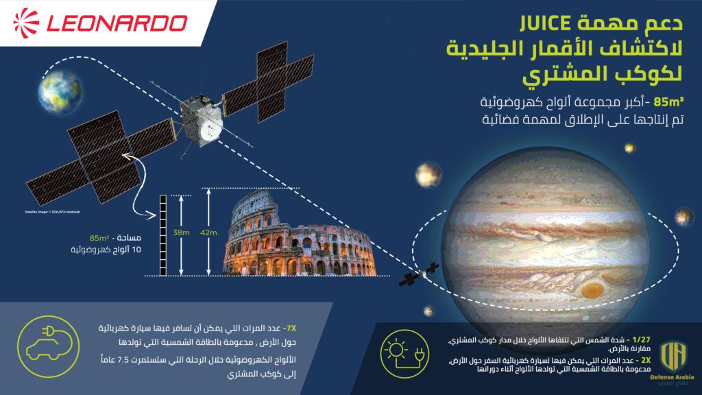 الألواح الكهروضوئية العشرة لمهمة (JUICE) أصبحت جاهزة. (JUICE) هي المهمة الأكثر طموحًا في برنامج الرؤية الكونية للفضاء التابع لوكالة الفضاء الأوروبية (ESA)، والذي تشارك فيه وكالة الفضاء الإيطالية (ASI) بمساهمة مهمة وكبيرة. تقوم شركة إيرباص، بصفتها المقاول الرئيس، بتطوير وبناء مركبة الفضاء JUICE، وستقوم شركة ليوناردو بتسليم الألواح إلى شركة (Airbus Defense and Space Netherlands) التي تعمل على تطوير المصفوفات الشمسية للمهمة الفضائية. حتى أثناء حالة الطوارئ المتعلقة بـ COVID-19، فقد أكملت شركة ليوناردو أنشطتها، واحترمت الجدول الزمني للتسليم.
