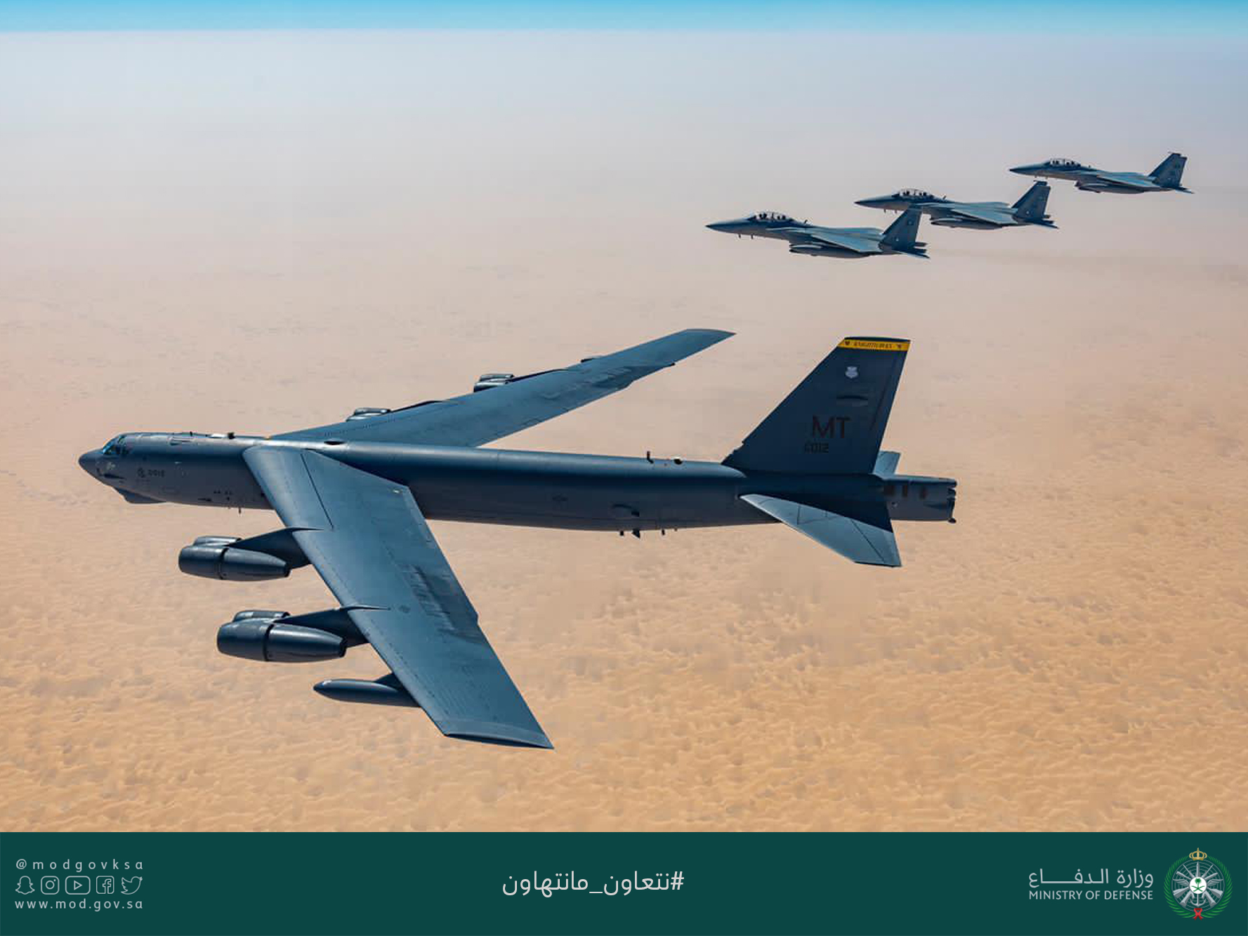 نشرت وزارة الدفاع السعودية صورا لمقاتلات إف-15 السعودية برفقة القاذفات الاستراتيجية بي-52 الأمريكية خلال مناورات مشتركة.