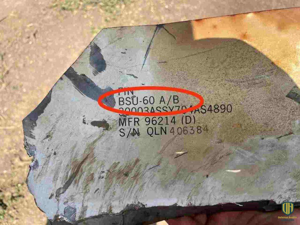 تشير الصور إلى حطام الصاروخ مع أرقام ملحوظة على جناحه الخلفي (BSU-60 A/B) ورقمه التسلسلي (QLN 406384).
