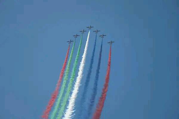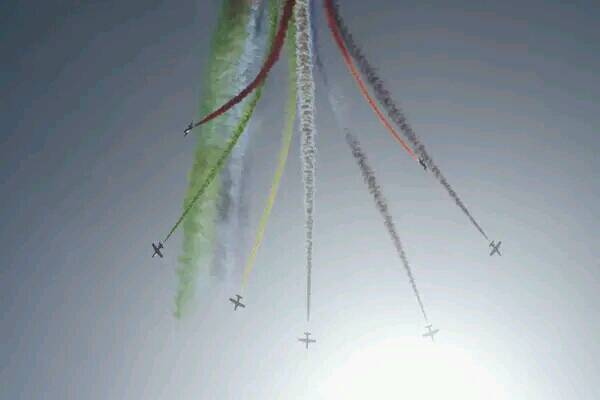 وظهر خلال الاستعراض الجوي سرب طائرات يضم 7 مقاتلات تتحرك بسرعة مكنتها من كسر حاجز الصوت، وهي المرحلة التي تتجاوز فيها سرعة الطائرة سرعة الصوت ويرافقها صدور ضجيج هائل.