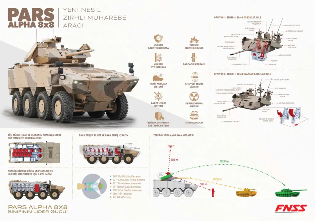 تفتخر شركة FNSS بالإعلان عن عرض عربة القتال المدرعة PARS ALPHA ثمانية الدفع (8×8) من الجيل الجديد لأول مرة على مستوى العالم في معرض الدفاع العالمي القادم، المقرر إقامته خلال الفترة من 4 إلى 8 فبراير 2024. وقد تم تصميم العربة من أجل السيطرة الشاملة في ساحة المعركة تمثل العربة مستقبل التدخل العسكري وذلك من خلال تلبية اهداف المهام التي تشكل تحديا كبيراً، حيث تعمل على تحقيق التفوق التكتيكي في الأداء القتالي وفقاً لمتطلبات المستخدم الحالية والمستجدة. تمثل العربة قفزة نوعية في حرب المدرعات، وترمز إلى بزوغ عصر جديد في مجال التنقل التكتيكي، والقدرة الاستثنائية على البقاء والقتال.