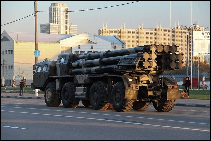 - BM-30 Smerch: نظام مدفع ذاتي الدفع من روسيا بعيار 300 مم، مُصمم لتدمير مخازن الذخيرة ومراكز القيادة وبطاريات المدفعية. يتمتع بقدرة عالية على الحركة السريعة، ويعتمد على تقنيات الرؤية الليلية ونظام GPS الروسي في توجيه الصواريخ.