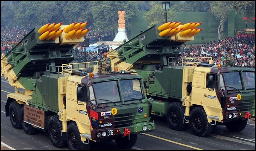 - Pinaka: هو نظام هندي بعيار 122 مم، يمتاز بمدى يصل إلى 40 كم للطراز الأول و60 كم للطراز المطور. وقد أثبت كفاءته في حرب كارجيل حيث تمكن من تدمير المواقع الباكستانية في المرتفعات.